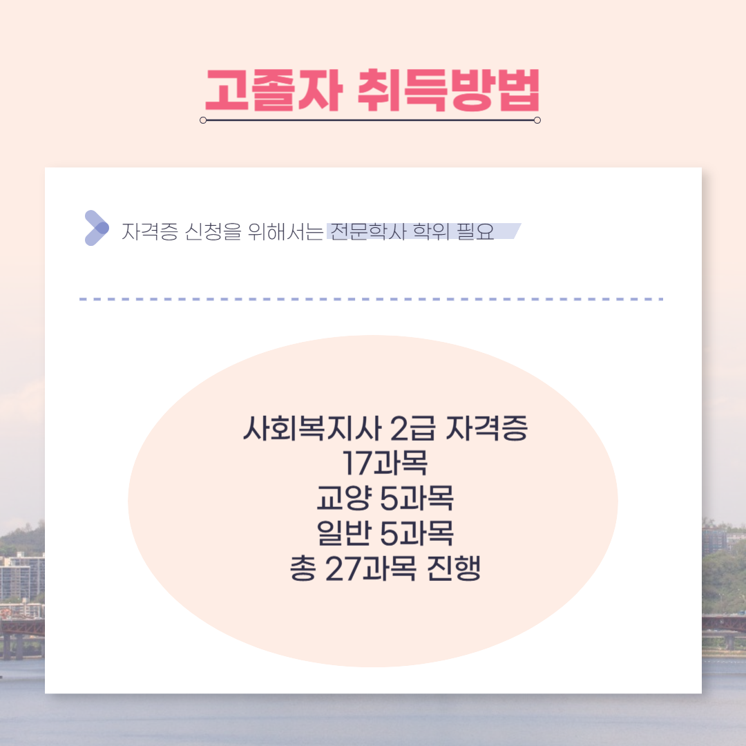 사회복지사 2급 자격증 취득을 위해서는 총 17과목(51학점)을 이수해야 합니다.