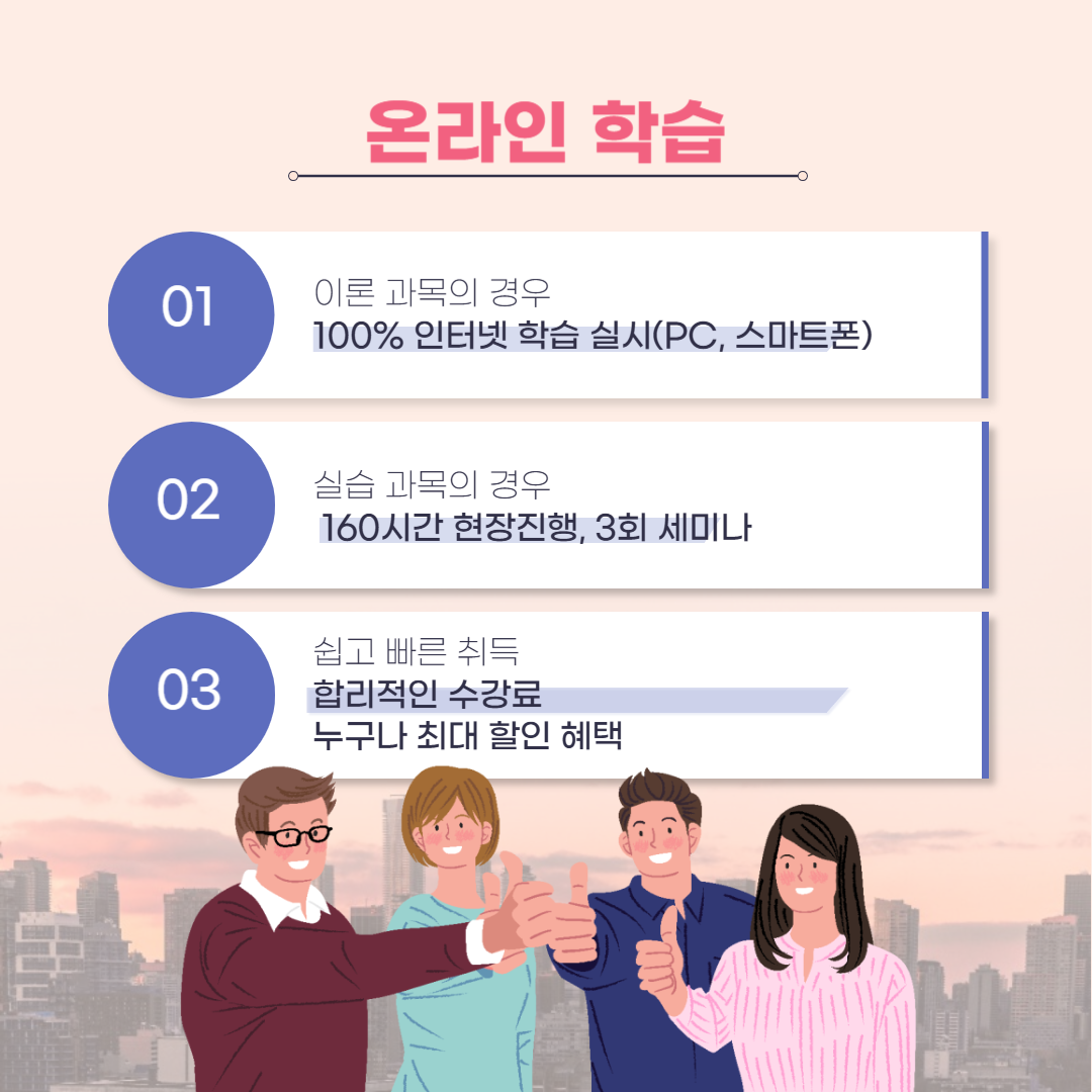 온라인 기반 학점은행제를 운영하는 화신사이버대학교 평생교육원 과정을 통해 이론 과목을 이수하고 실습까지 진행하는 방법이 가장 효율적입니다.